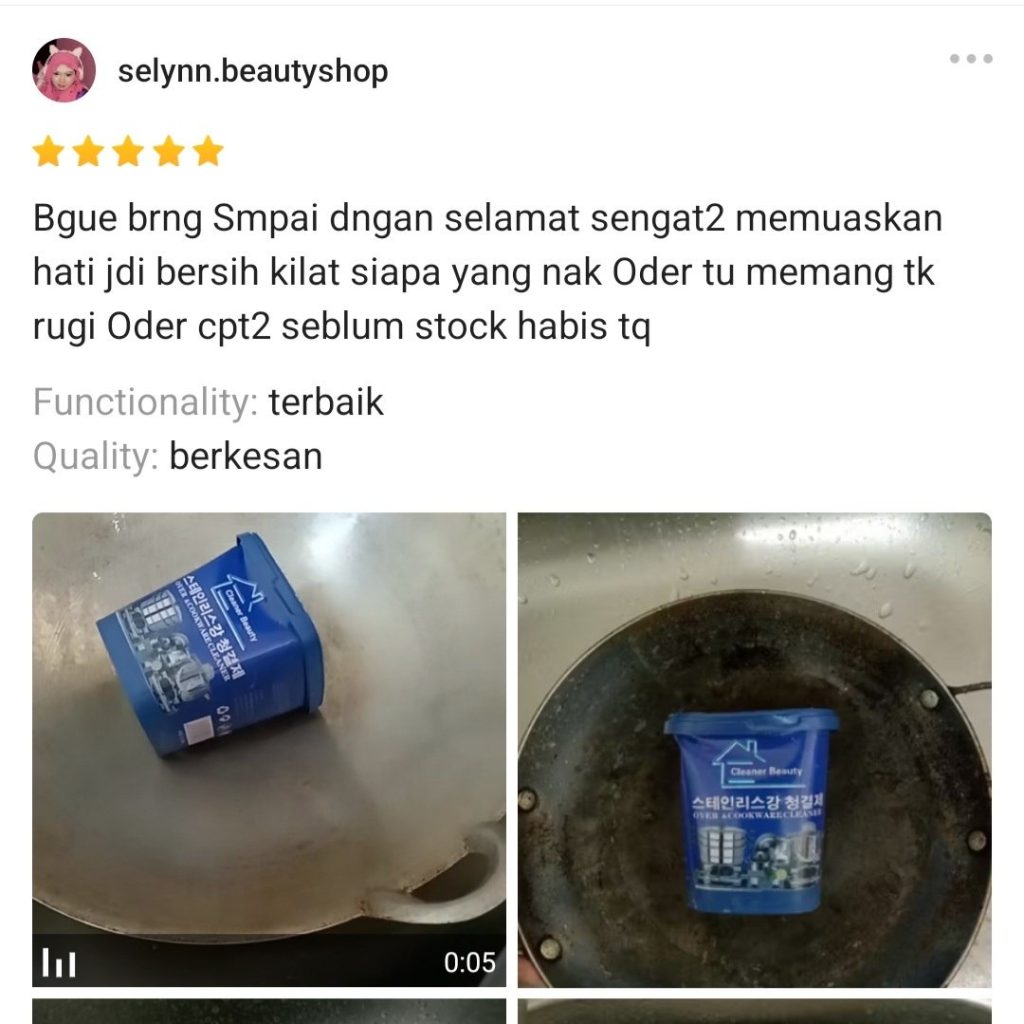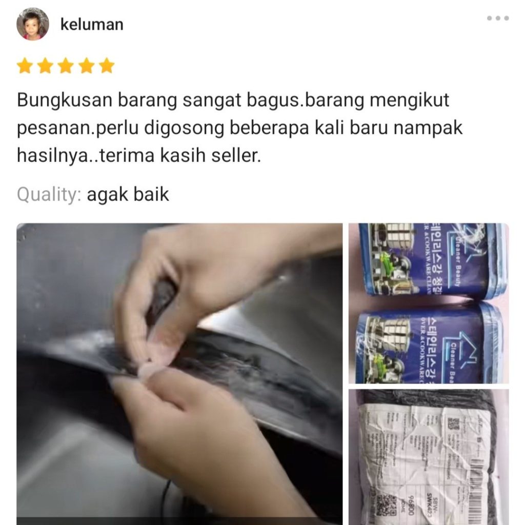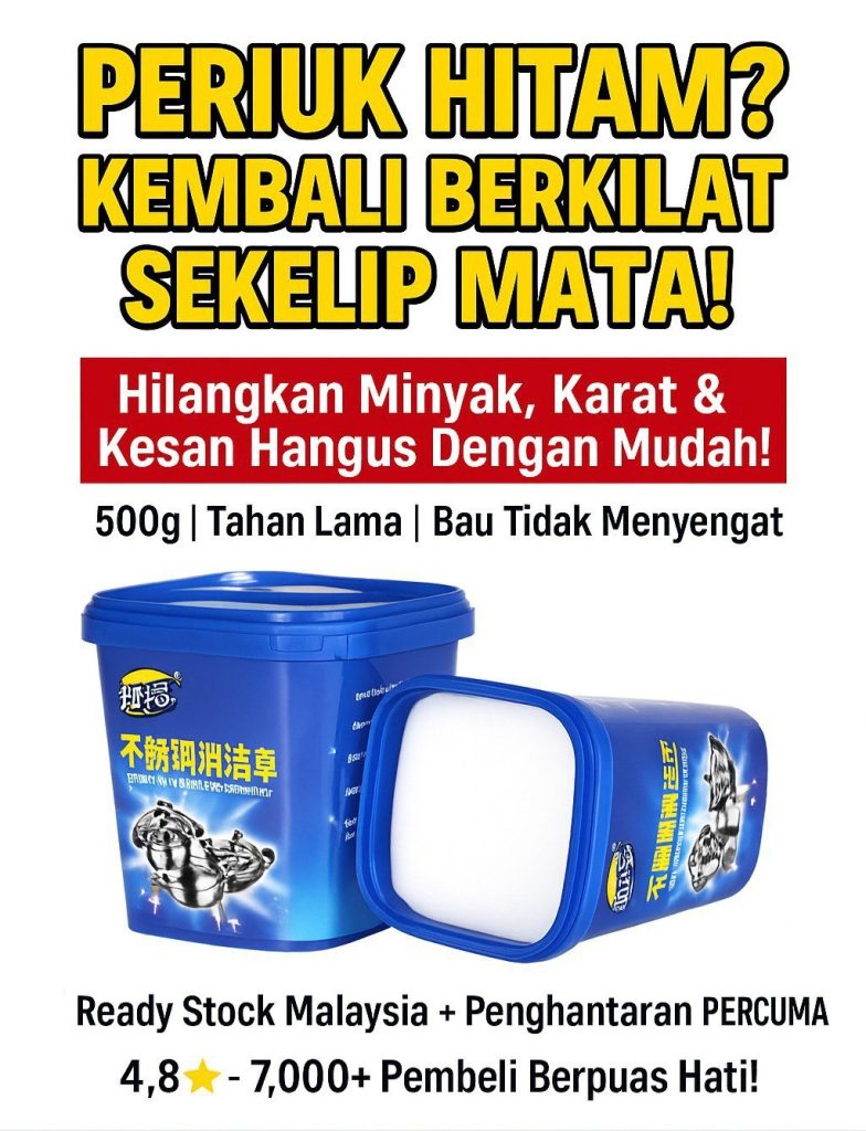 ✅ Sesuai untuk stainless steel, periuk, oven & dapur gas ✅ Hilangkan kesan hangus, karat & minyak degil dengan mudah ✅ Tidak merosakkan permukaan logam ✅ Isian 500g tahan lama & jimat ✅ Bau tidak menyengat – sesuai untuk kegunaan harian ✅ 4.8★ rating – lebih 7,000 unit telah terjual!