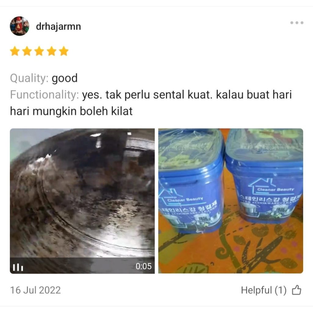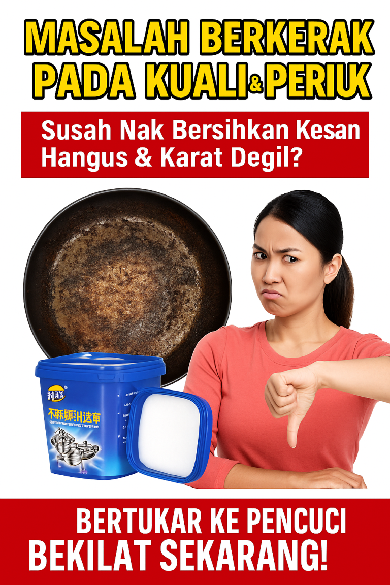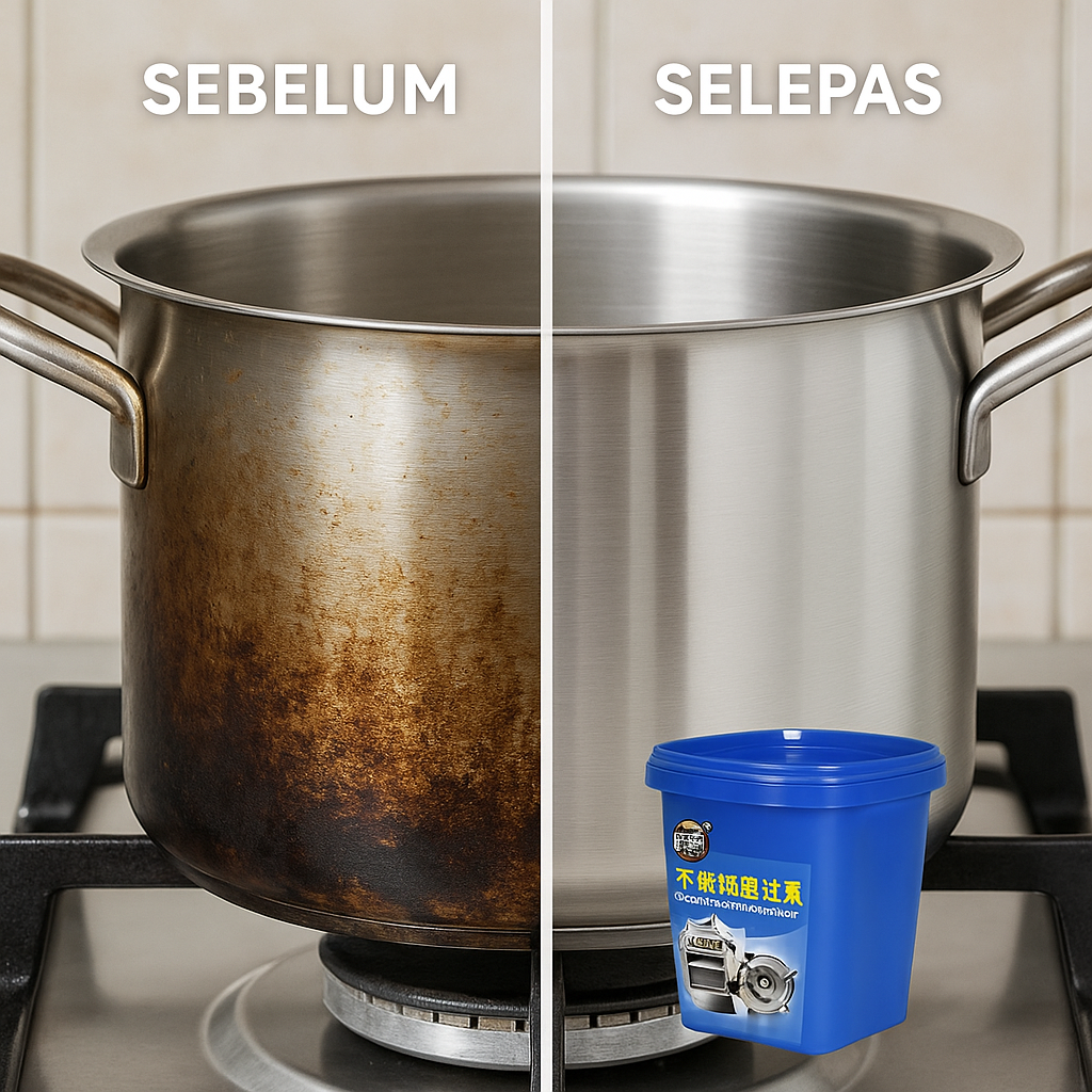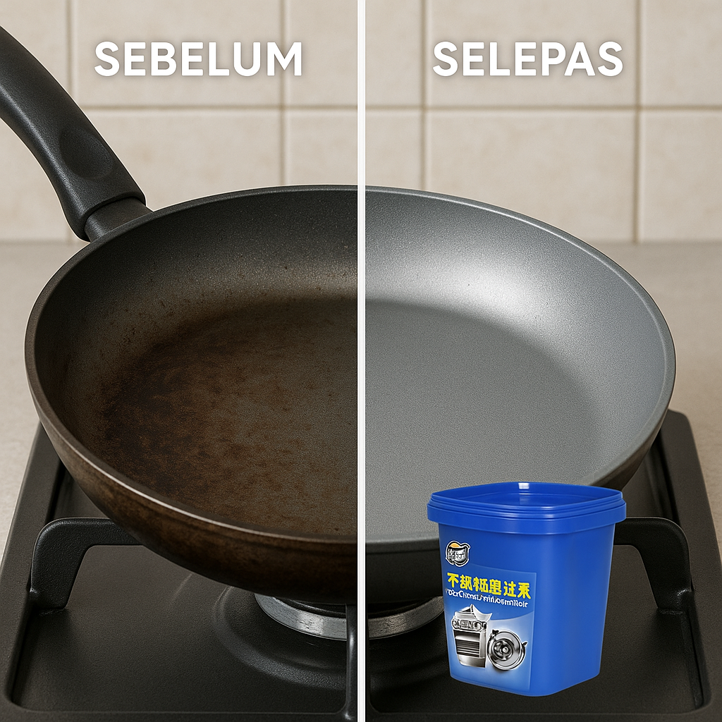 🧽 Periuk & kuali berkerak, hitam legam — boleh buat kita stress hari-hari. Dah sental pun masih tak hilang, makin hari makin malu nak jamu tetamu. Rasa macam dapur pun nampak kotor & tak bersih.